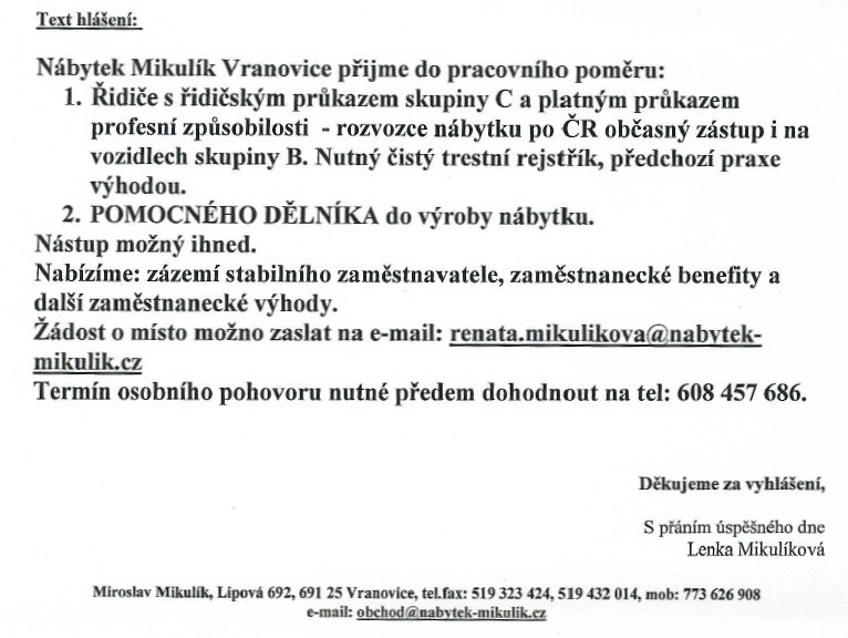 Úvod > Aktuálně > Nabídka pracovních míst (Nábytek Mikulík Vranovice)