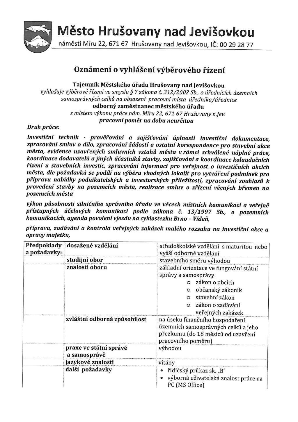 Úvod > Aktuálně > Oznámení o vyhlášení výběrového řízení - odborný zaměstnanec městského úřadu