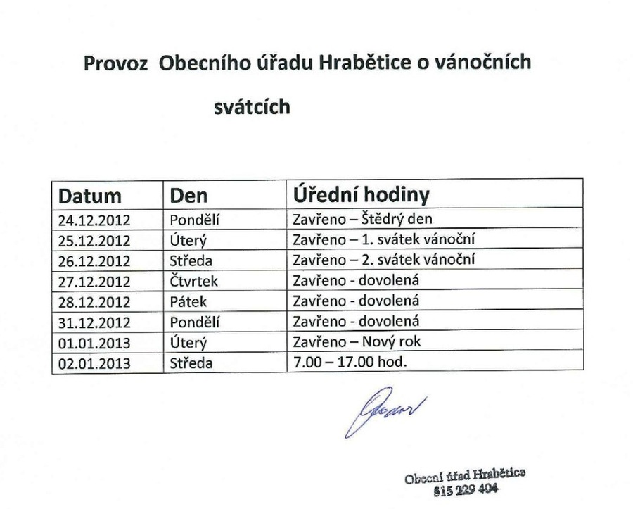 Provoz Obecního úřadu Hrabětice o vánočních svátcích